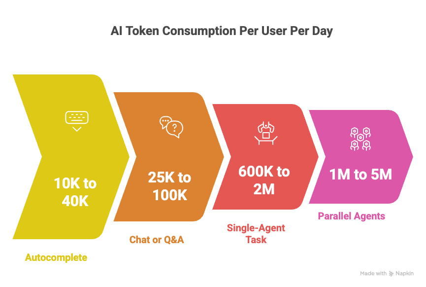 Workflow migration. Users start at the easiest entry point, usually autocomplete or simple chat. They discover chat. They discover agents. Each step up the complexity ladder is a 5 to 20× increase in tokens per interaction, and it happens without any change in headcount.