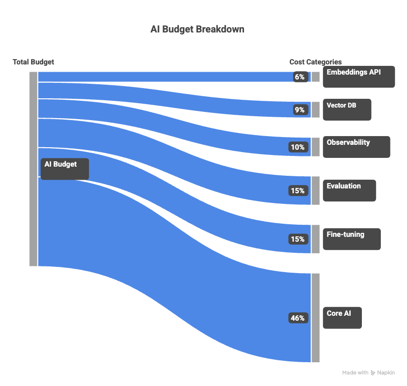 Embeddings API calls: 3 to 8%. Every retrieval-augmented feature runs embeddings on the query and on the stored documents. Often billed on a separate line, so it disappears from the “AI cost” conversation.
